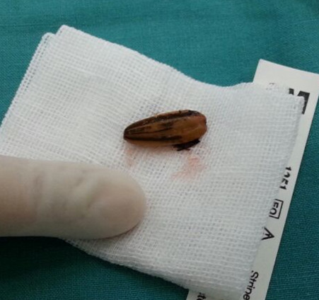 6月15日上午,我院耳鼻咽头颈外科从一名2岁男孩的气管中取出一枚带壳的葵瓜子。正是这枚小小的瓜子,险些要了宝宝的命。