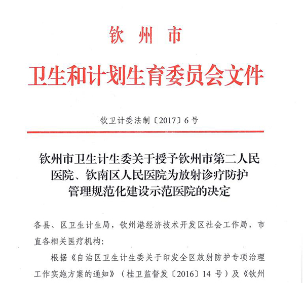 5月12日,钦州市第二人民医院传来喜讯,由于不断完善自身防护管理工作,落实各项防护措施,该院被钦州市卫生计生委授予我市放射诊疗防护管理规范化建设示范医院,这也是我市获此荣誉的首批两家医院之一。