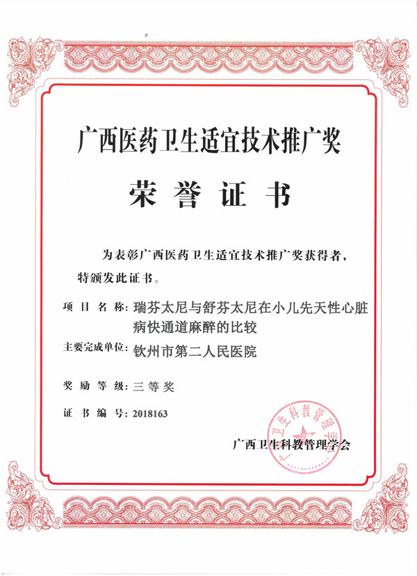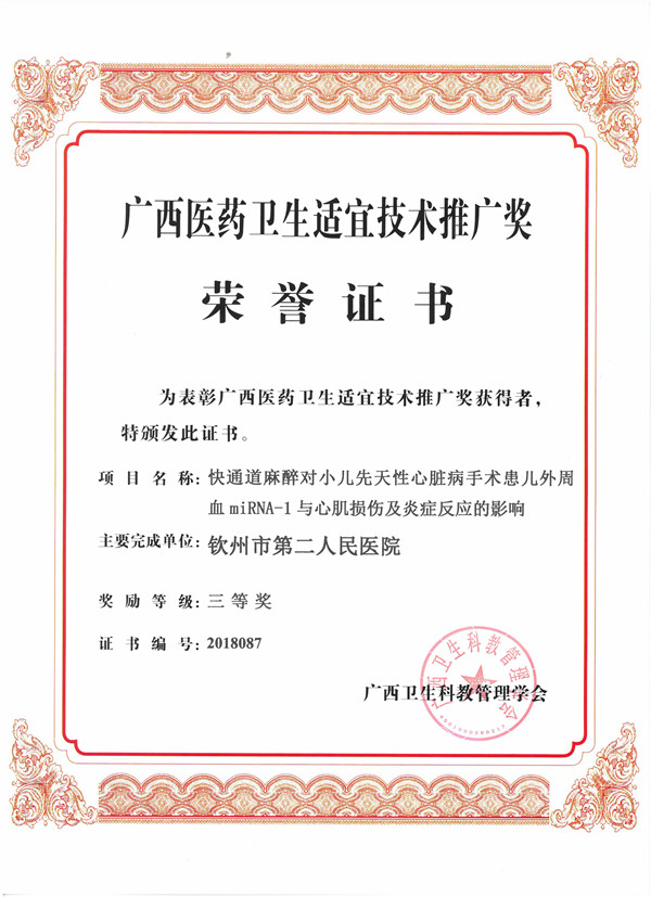 麻醉科副主任医师莫伟波主要负责的《快速通道麻醉对小儿先天性心脏病手术患儿外周血miRNA-1与心肌损伤及炎症反应的影响》得到麻醉科、心脏外科、ICU、检验科等多科的协作和支持,于2018年3月通过钦州市科技局组织的钦州市科学研究与技术开发技术项目的验收。