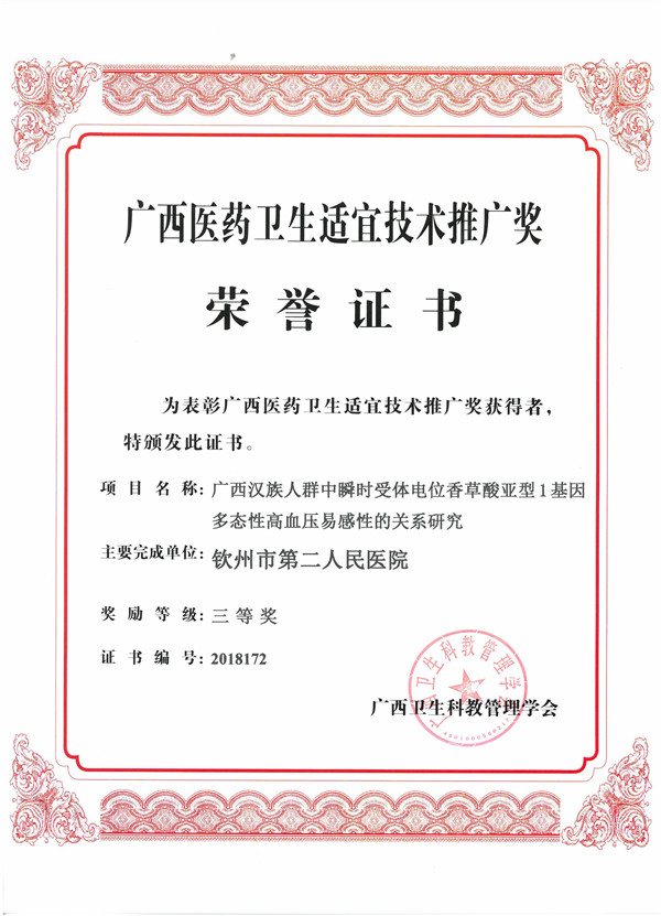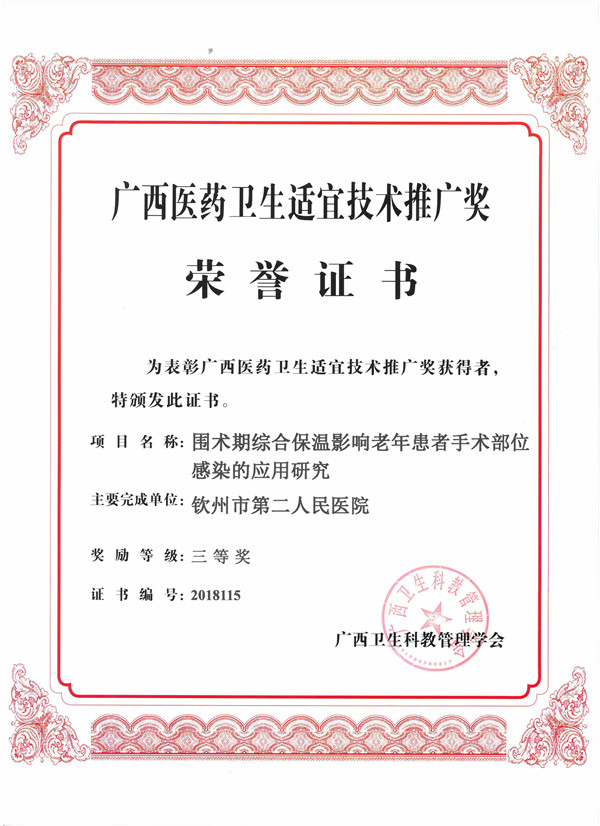 近日,广西卫生科教管理学会对2018年度广西医药卫生适宜技术推广奖项目单位及个人予以表彰奖励。钦州市第二人民医院今年共有5项科研成果获得广西医药卫生适宜技术推广奖三等奖。本年度钦州市共有10项科研项目获奖,钦州市第二人民医院是我市获得此类奖项最多的医疗卫生机构。从2007年起至今,我院共有22项成果获广西医药卫生适宜技术推广奖。