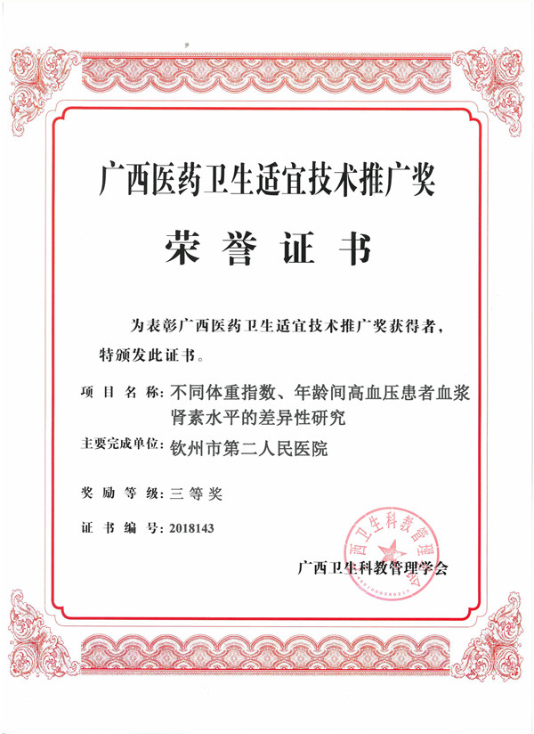 该科研明确了高血压患者不同体重指数、年龄间的血浆肾素水平等因素的差异性,说明高血压的发病特点和为高血压的防治提供理论依据。