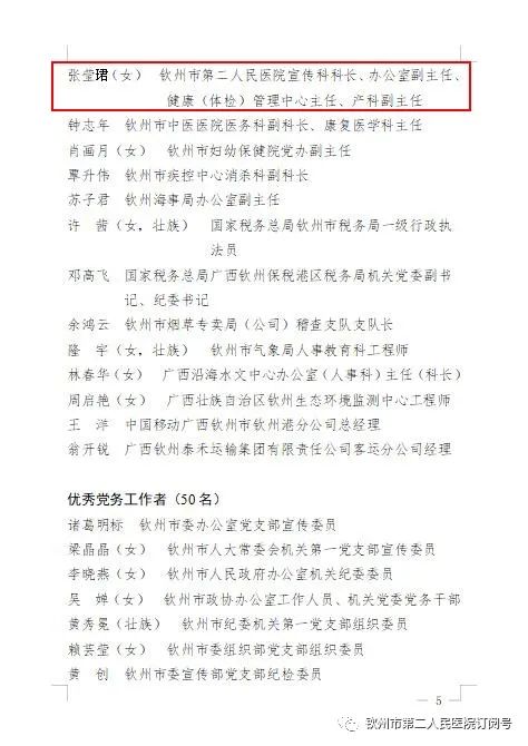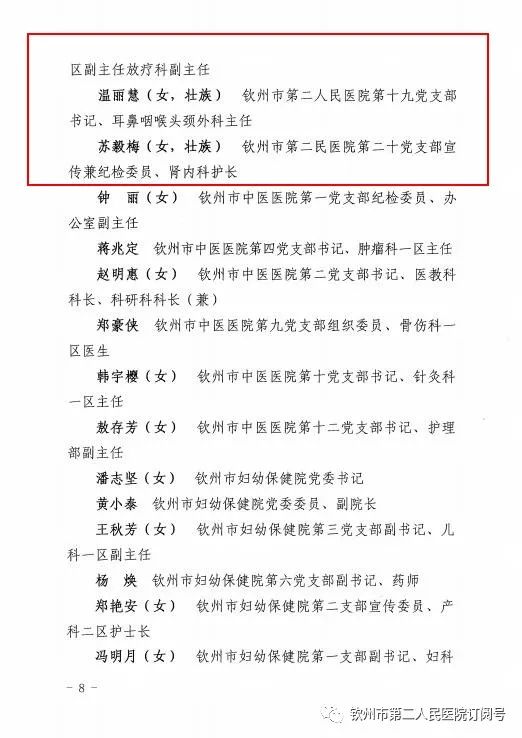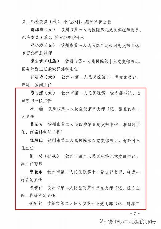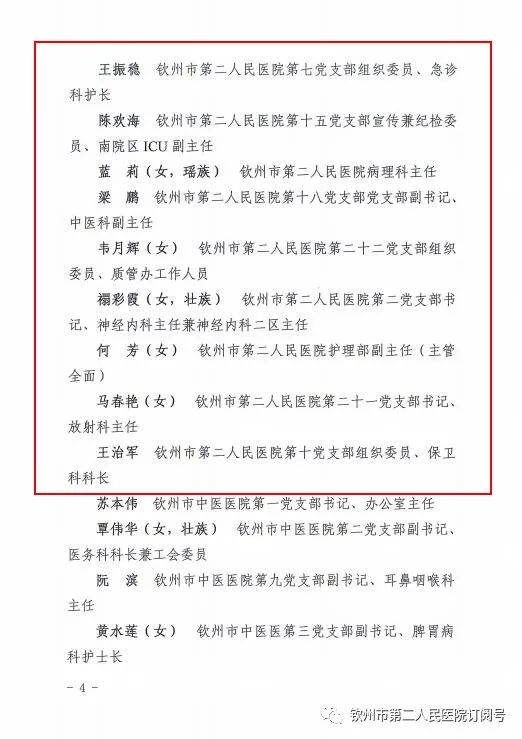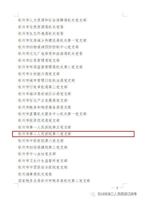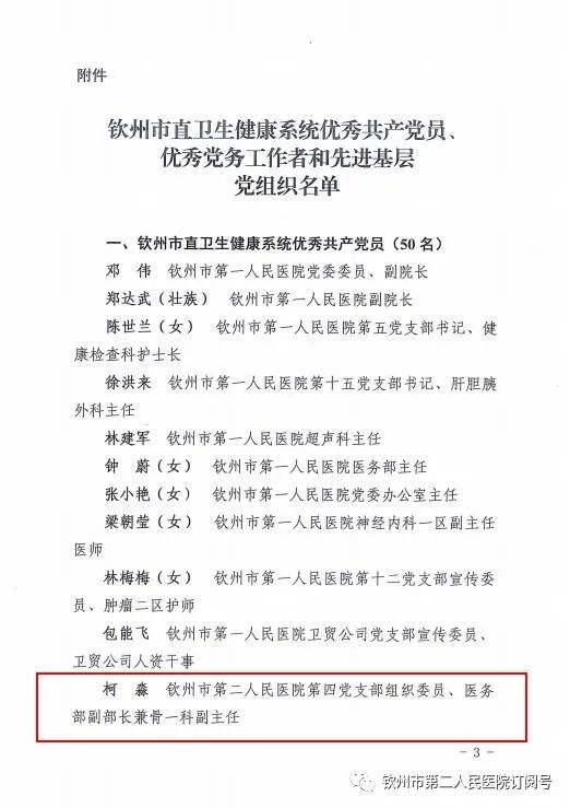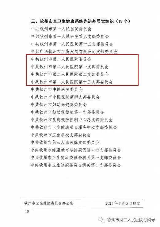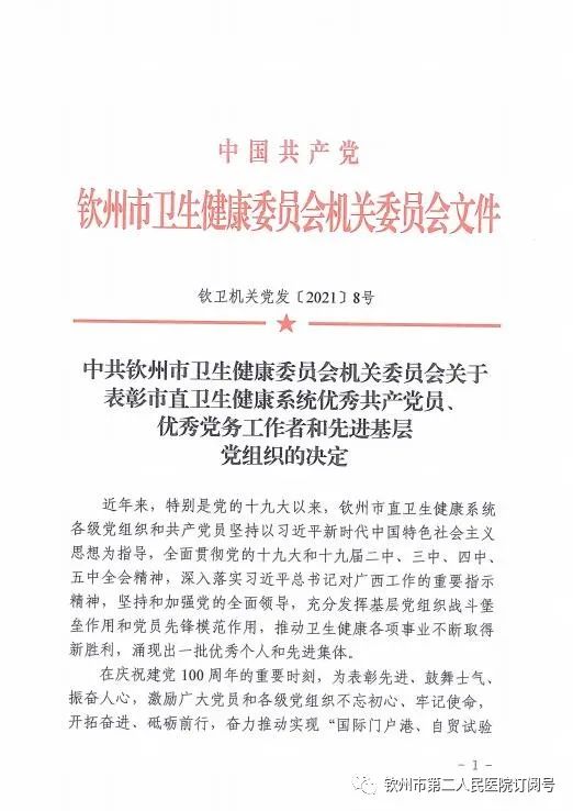 根据中共钦州市卫生健康委员会机关委员会印发《关于表彰市直卫生健康系统优秀共产党员、优秀党务工作者、先进基层党组织的决定》,我院柯淼等10人获评钦州市直卫生健康系统优秀共产党员;陈丽媛等10人获评钦州市直卫生健康系统优秀党务工作者;我院党委、第一党支部、第二党支部、第十三党支部分别获评钦州市直卫生健康系统先进基层党组织。