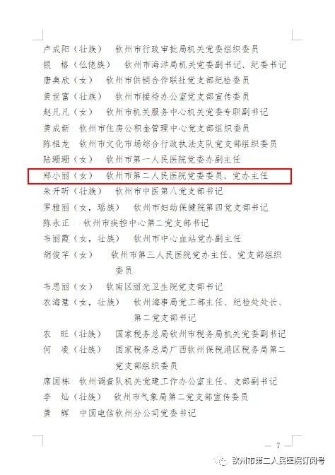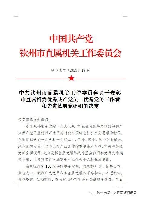 6月29日,中共钦州市直属机关工作委员会印发《关于表彰市直属机关优秀共产党员、优秀党务工作者和先进基层党组织的决定》,我院张莹珺同志获评市直属机关优秀共产党员;郑小丽同志获评市直属机关优秀党务工作者;第八党支部获评市直属机关先进基层党组织