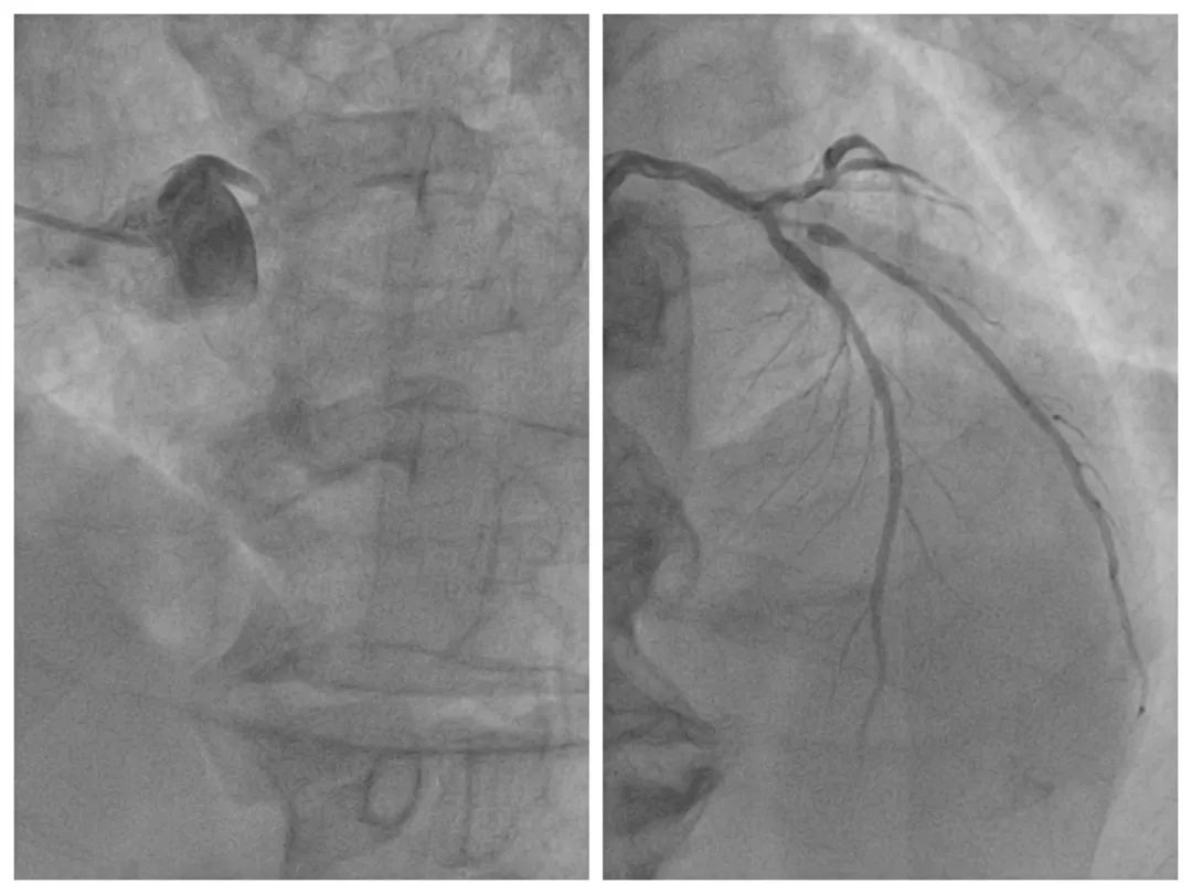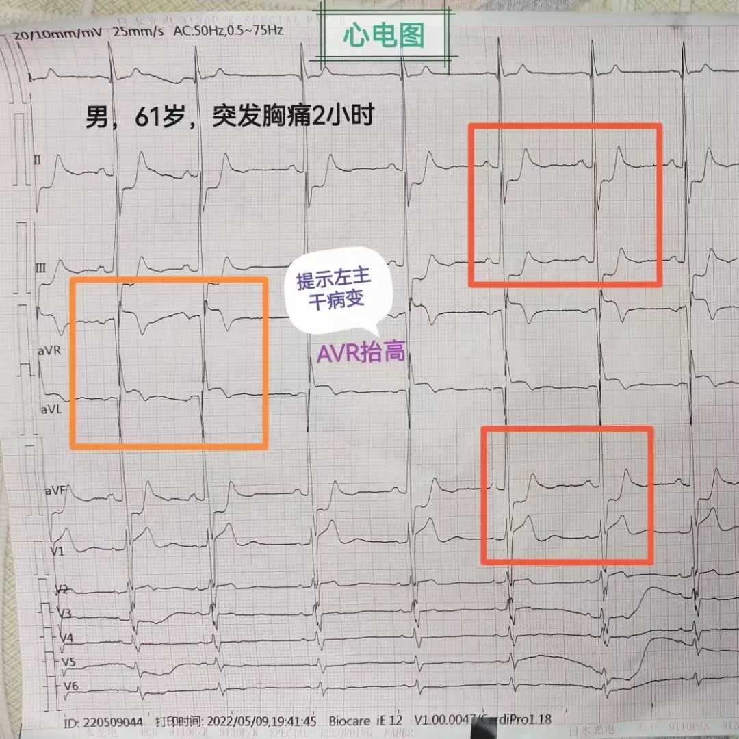 一个月前,黄大爷无明显诱因下出现胸痛,以胸骨后为主,呈持续性、压榨性疼痛,伴大汗淋漓,家属将其送到当地卫生院诊治,行心电图检查提示急性心肌梗死,病情危急,家属立即送到我院进一步抢救。患者血压74/49mmHg,已经处于休克状态,急诊冠状动脉造影提示:左主干中段后完全闭塞,前向血流TIMI0级。