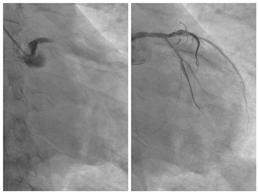 ▲术前(左图)左主干中段后完全闭塞,术后闭塞血管得以开通(右图)