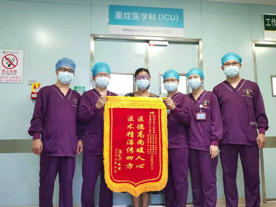 ▲患者家属向重症医学科二区医护人员赠与感谢锦旗