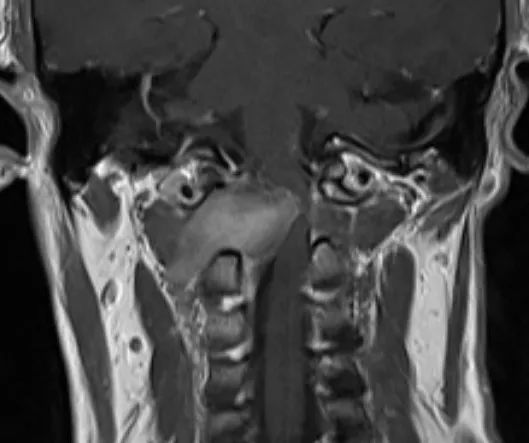脊柱脊髓外科主任仇继任主任医师对罗先生的病情非常重视,为了查明原因,立即给罗先生完善了相关检查,并对罗先生的症状和体征进行详细分析。各项检查回报后证实了仇继任的考虑,患者第1颈椎椎管内长了一个肿瘤,且位置非常贴近脑干延髓生命中枢,由于特殊解剖生理特点,此处的肿瘤易并发四肢瘫痪和呼吸功能障碍,甚至危及生命。该部位的手术难度大,操作技术要求高,术中处置不当极易导致患者呼吸心跳停止,因此在治疗上存在较大的困难。