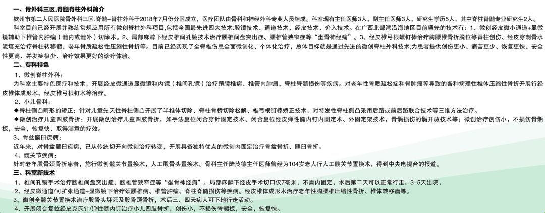 近年来,钦州市第二人民医院脊柱脊髓外科(骨外三科)不断探索新技术,不仅开展了成人的各种脊柱脊髓高难度手术,还开展了小儿高位椎管内硬膜外血肿清除、孔镜下椎间盘摘除、经皮椎弓钉棒系统内固定治疗压缩性骨折、高位椎管肿瘤切除等高难度四级手术,专业技术水平不断提升,为保障人民群众身体健康保驾护航。