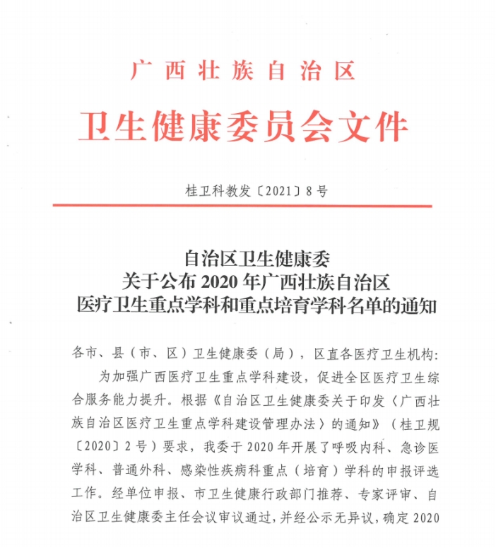 喜讯!我院呼吸与危重症医学科(呼吸内科)获2020年广西医疗卫生重点(培育)学科