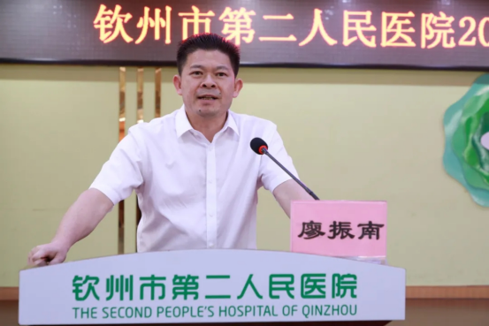 会上,院长廖振南为大会致辞,他首先代表医院党政领导班子,向奋战在一线的全体医师们致以节日的祝福,向受到表彰的百名优秀医务工作者表示热烈的祝贺。他指出,长期以来,我院广大医务工作者弘扬敬佑生命、救死扶伤、甘于奉献、大爱无疆的精神,为生命护航,谱写了一曲曲大爱之歌。在疫情防控最前沿、在新冠疫苗接种、核酸检测的第一线,为人民群众筑起了一道坚不可摧的健康长城。他希望全院干部职工以先进模范为榜样,秉承医者仁心、强化使命担当,继续当好守护人民健康的忠诚卫士,在时代的召唤和人民的需要中砥砺前行,为医院事业的高质量发展再立新功,为实现健康钦州、健康中国梦书写最美华章!