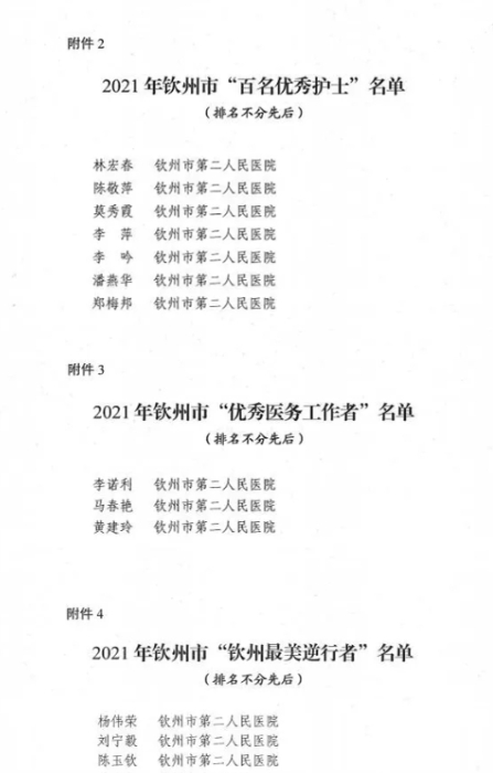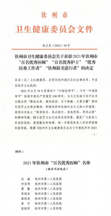 根据《钦州市卫生健康委员会关于表彰2021年钦州市“百名优秀医师”“百名优秀护士”“优秀医务工作者”“钦州最美逆行者”的决定》文件精神,我院多名医务人员获得表彰,其中,杜瑜、何东明、蒙勤、李绍龙、秦培英、曾宇、张桂萍获评“百名优秀医师”称号;林宏春、陈敬萍、莫秀霞、李萍、李吟、潘燕华、郑梅邦获评“百名优秀护士”称号;李诺利、马春艳、黄建玲获评“优秀医务工作者”称号;杨伟荣、刘宁毅、陈玉钦获评“钦州最美逆行者”称号。