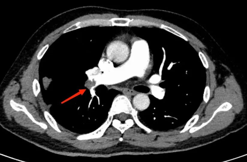 不放过任何一个可疑因素,杨先生在医护人员的陪同下完善了肺动脉CTA检查,检查结果出来,果然是肺栓塞!杨先生肺部那一片片密度增高带有晕征的病变,以及抗感染治疗无效的疑点都得到了解释,是肺栓塞导致了肺梗死。