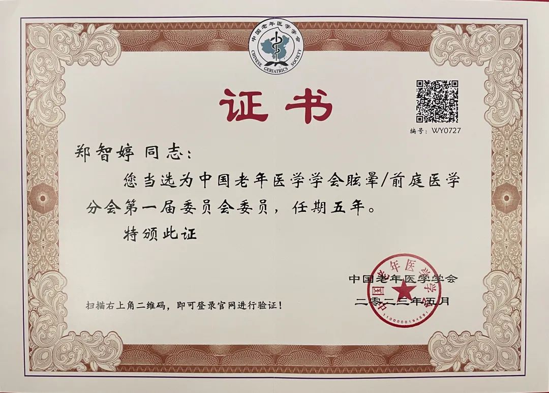 会议同时增补了中国老年医学学会眩晕/前庭医学分会第一届委员会委员。我院神经内科一区、眩晕中心主任郑智婷从全国眩晕领域专家中脱颖而出,有幸增选为中国老年医学学会眩晕/前庭医学分会第一届委员会委员,任期为五年。