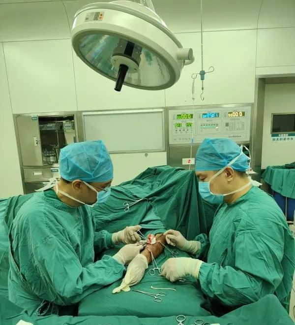 ▲ 李洪波、包日明为患者行切开取栓及狭窄段球囊扩张治疗