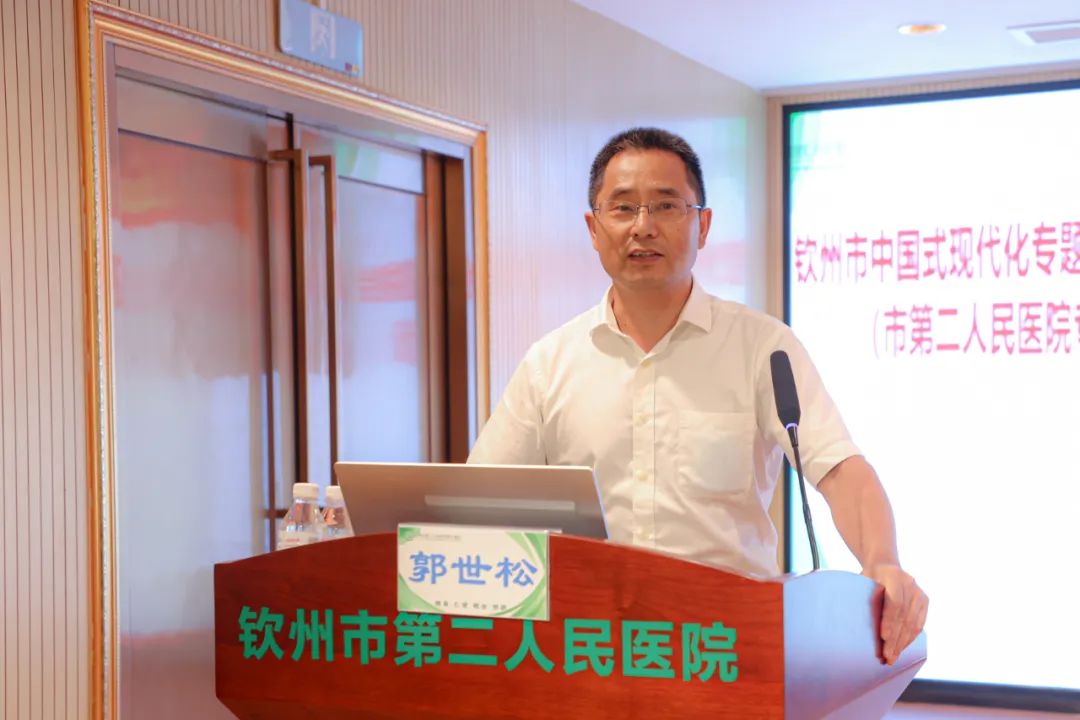为深入学习宣传贯彻习近平新时代中国特色社会主义思想和党的二十大精神,贯彻落实全国两会精神,凝聚起建设中国式现代化的磅礴力量,7月19日下午,钦州市第二人民医院邀请钦州市宣讲团成员、钦州市人民政府特约研究员、中共钦州市委党校特约教授、钦州市地方志办公室党组书记、主任郭世松到我院开展中国式现代化专题宣讲。钦州市第二人民医院党委书记黎华彪主持宣讲会,市二医院在家党政领导班子成员及全体党员干部参加学习。