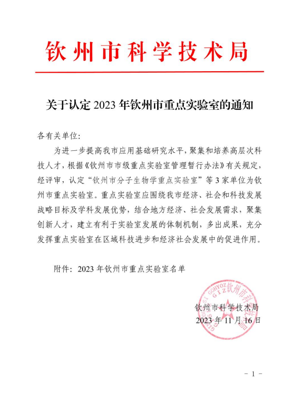 近日,钦州市科学技术局发布了《关于认定2023年钦州市重点实验室的通知》,其中,钦州市第二人民医院榜上有名,获认定为“钦州市精准药物治疗重点实验室”!