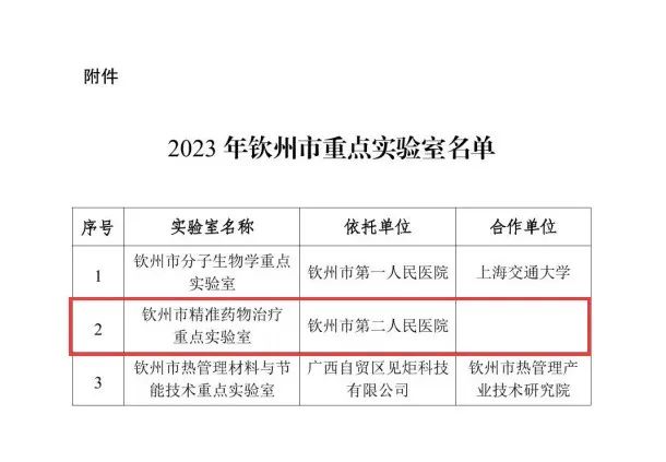 喜报 | 钦州市第二人民医院获认定为“钦州市精准药物治疗重点实验室”