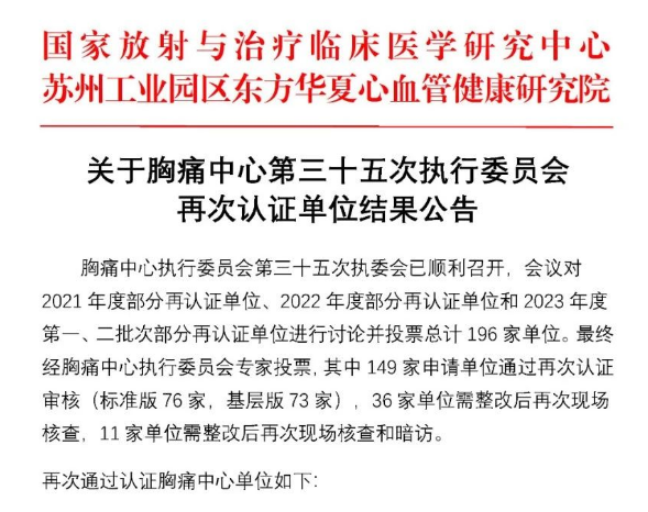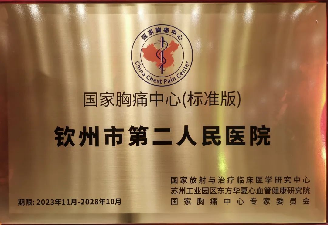 2019年10月31日,钦州市第二人民医院胸痛中心通过2019年度第三批次胸痛中心的国家标准版认证,是北部湾沿海地区首家通过认证的国家级标准版胸痛中心。这标志着我院对急性胸痛患者的综合救治能力达到国家级标准和水平。2023年11月通过国家胸痛中心专家委员会再次认证审核!