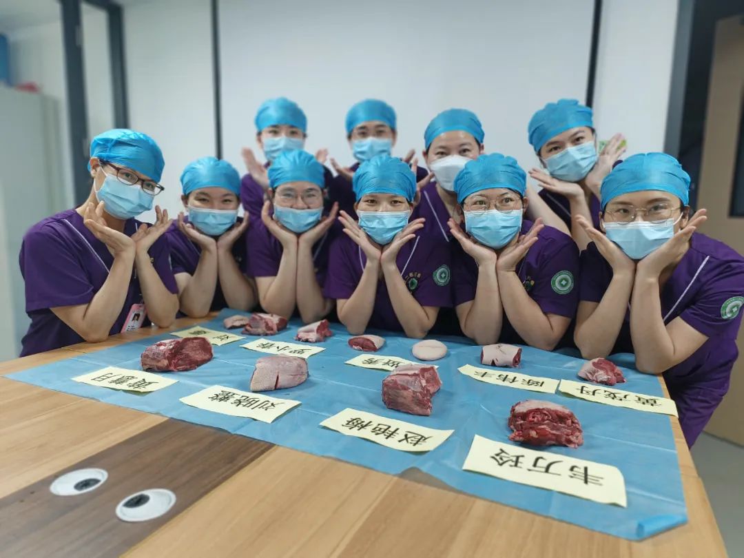 技能操作阶段,全体助产士利用牛舌作为道具,分为几组进行比拼,从个人准备、物品准备、环境要求等环节都严格对待,温和的话语、轻柔的动作,整个操作过程充分体现对“产妇”的关爱和安慰,每一个细节无不体现助产士的专业素养。