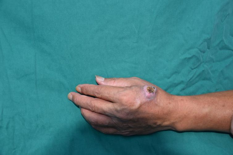 患者陈叔(化名),45岁,发现左手背肿物反复溃烂1个多月,且逐渐出现皮肤变黑及渗出加重。为寻求进一步治疗来到我院创面修复中心综合外科住院治疗。