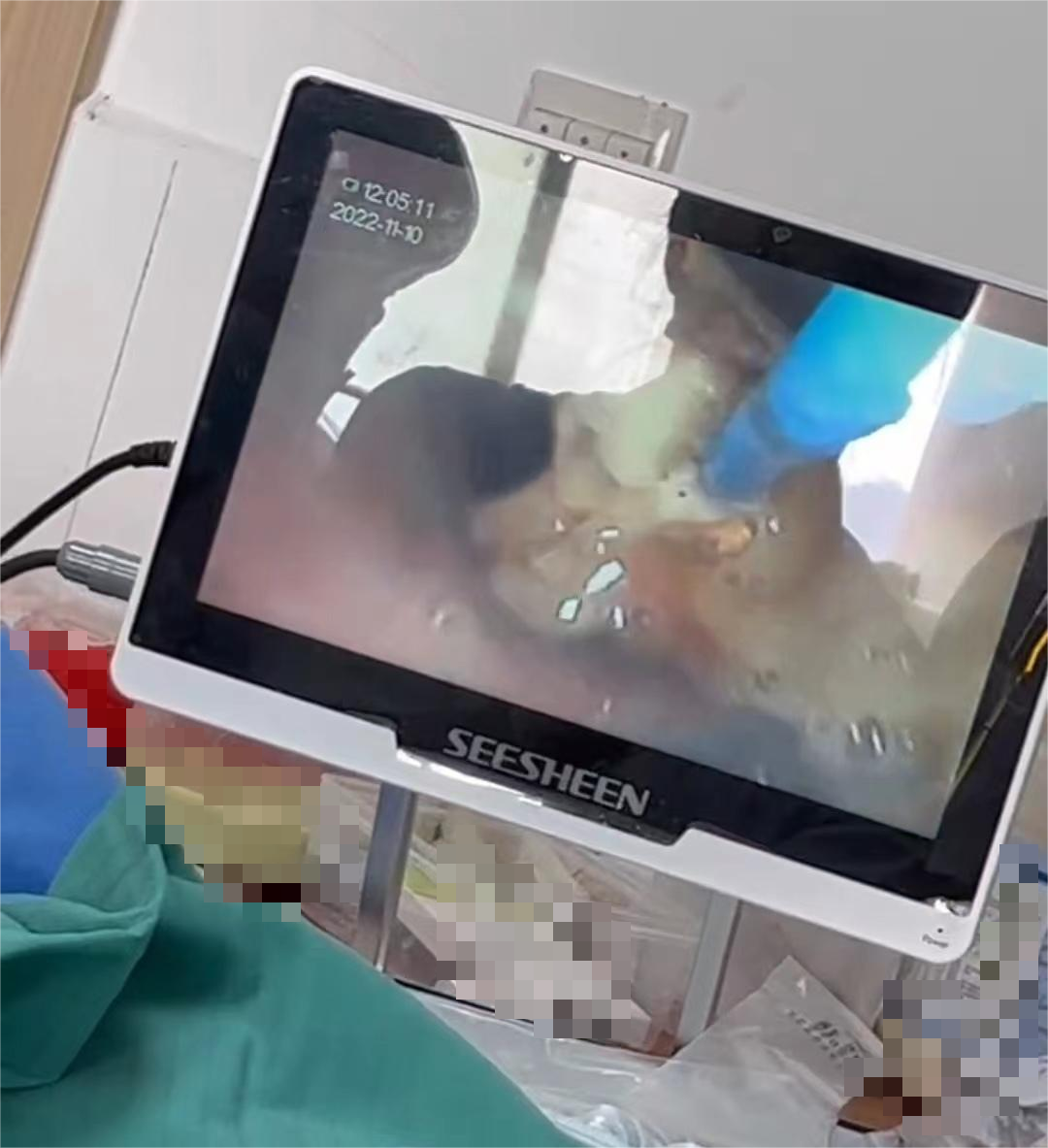 当天下午,患者突发呼吸困难,血氧逐渐下降进入昏迷,给予床边吸痰、球囊辅助通气、药物等处理,效果甚微,患者血氧迅速下降到40%,心率下降到40次/分,结合其气道狭窄病史,考虑气道再次出现瘢痕肉芽堵塞,加上气管套管内痰栓堵塞,因此留置气管套管也无法解决患者呼吸困难问题,生死存亡之际,在我院许承琼副院长及黄婷婷主任带领下,立即给予患者拔除原来的气管套管,血氧稍上升到70%,考虑患者肉芽堵塞如果不立即处理,患者呼吸困难无法真正缓解,决定紧急行床边气管镜介入治疗。