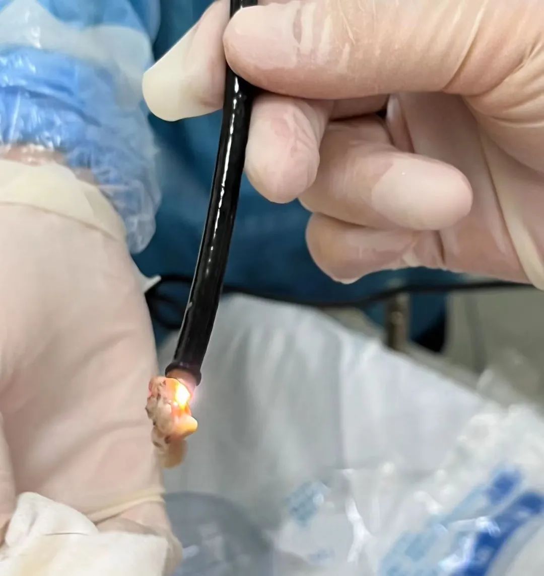 经过长达1小时的努力,成功给予患者内镜下切除气道新生物,打通大气道,患者血氧恢复正常,呼吸平顺,生命征平稳,意识转清,且无需再次留置气管插管,将患者成功从死亡边缘拉了回来!