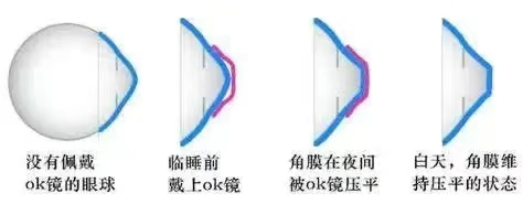 宏观上说,OK镜使角膜中央区域的弧度变平,从而暂时性降低近视度数。微观上说,由于力的作用,使得角膜上皮细胞重新分布,产生一个微米级的“凹透镜”,改变光线焦点,使成像在视网膜中心前面的焦点,移到视网膜上,从而清晰视物。而把视网膜周边的焦点移到视网膜前,呈现近视性离焦状态,从而减缓眼轴增长,延缓近视。