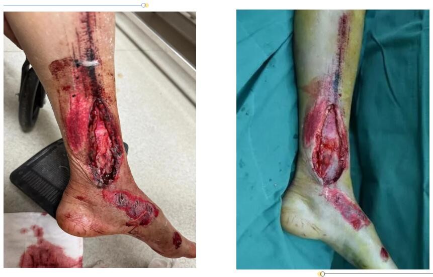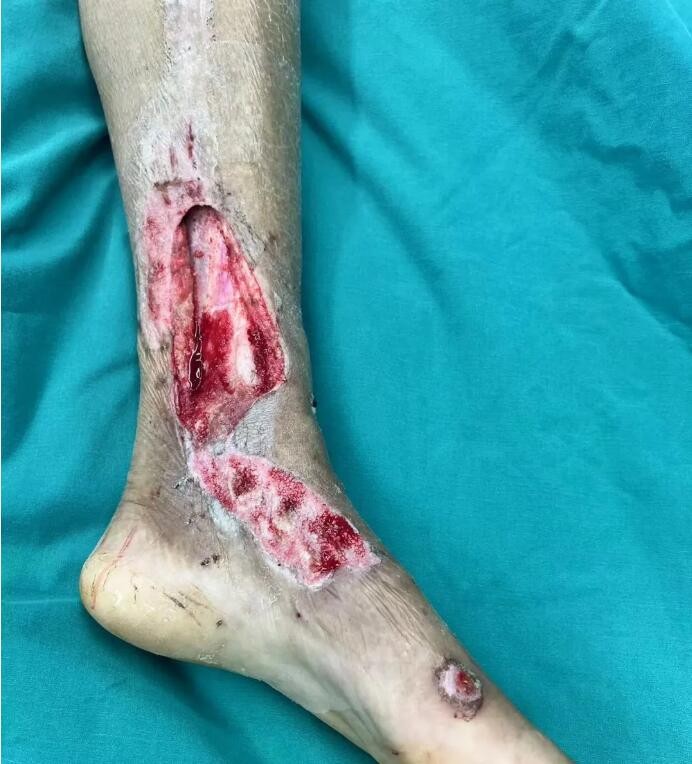 ▲入院时左小腿10×15cm²大面积缺损,胫骨外露。