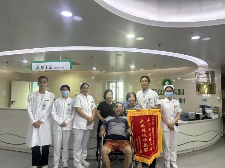 经过2周的治疗,CHANG大爷慢慢地说话清晰了、握手有劲儿了、可以稳稳地抬腿、自行坐至床旁、缓缓地扶床站立。CHANG大爷及家属对治疗效果十分满意,对卒中救治团队的专业技术及护理服务充分认可。出院当天,CHANG大爷及家属送来一面锦旗表达了对脑血管病科医护人员的感激之情。
