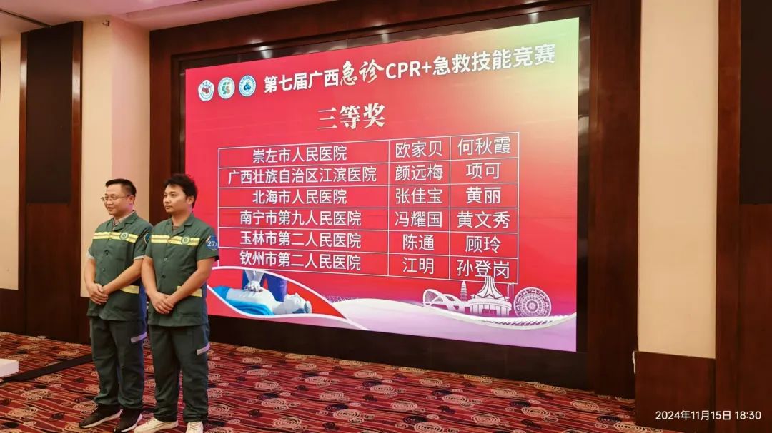 11月15日,由广西医学会主办,广西医学会急诊医学分会、广西医科大学第二附属医院、广西医科大学附属武鸣医院、广西医科大学第一附属医院、广西医科大学附属肿瘤医院承办的第七届广西急诊 CPR(心肺复苏术)+急救技能竞赛在广西南宁举办。我院参赛选手江明、孙登岗经过层层比拼,最终荣获三等奖。