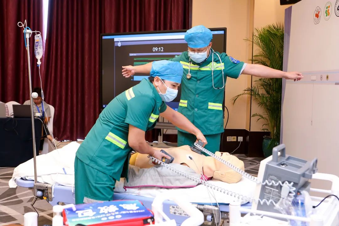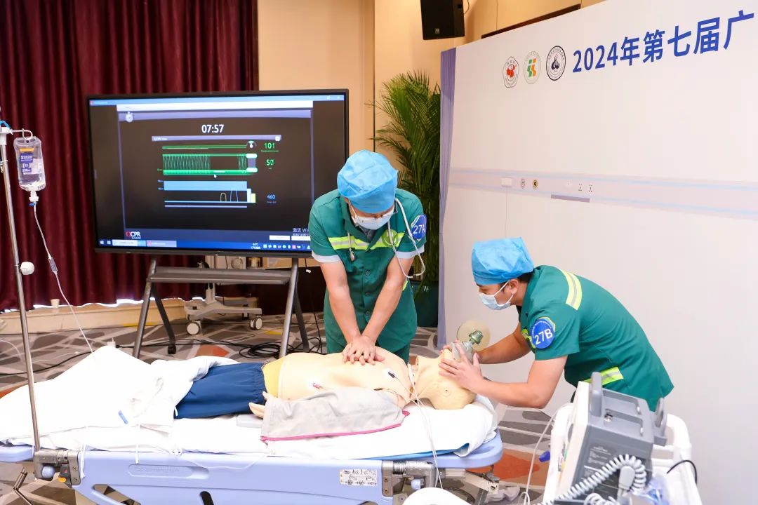 急救技能竞赛是对各单位急诊急救技能的一次大检阅,此次竞赛是广西区内高水平的技能竞赛,有来自全区50家医院的150名医务人员同台竞技。旨在通过比赛提高急诊医护人员的临床思维、专业实践及团队协助能力,提高急救理论水平,增强急救意识及应急能力,展现急诊医护人员的风姿风采。比赛是在模拟现实病例的情景下,通过高端模拟人模拟出胸痛、异常心律、心脏骤停等症状,同时也增加了有家属在现场的临床场景,要求各参赛队选手在6分钟内根据高端模拟人的症状对患者快速做出判断,完成救护操作。我院参赛选手在比赛场景中展现了冷静、果断和专业的急救技能,获得了评委的一致好评。