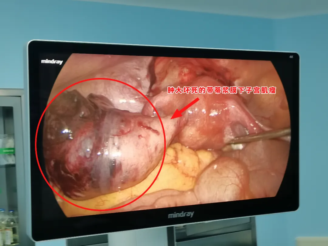 近日,妇科接诊了一位46岁的女患者,因下腹剧烈疼痛半天入院,无畏寒、发热,无异常阴道流血,无腹泻。妇检子宫压痛明显。查妊娠试验及C反应蛋白均正常。B超及磁共振提示子宫肌瘤大小约6x5cm。考虑腹痛原因为子宫肌瘤蒂扭转可能性大,予紧急行腹腔镜探查术。术中见肿大坏死的带蒂浆膜下子宫肌瘤6x5cm,予行肌瘤切除,病理学回报子宫平滑肌瘤(大面积梗死,符合扭转的临床诊断)。