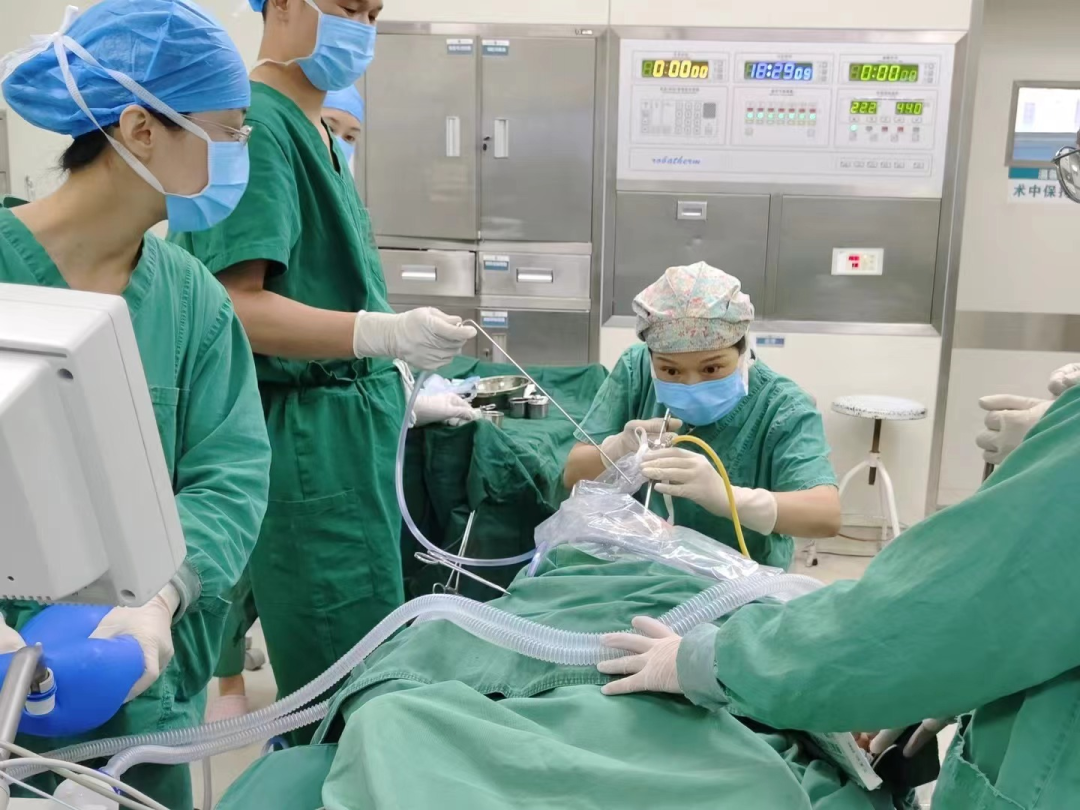 明确了手术方式,温丽慧与黎必万两位主任的团队通力合作、默契地配合,在生死时速的5分钟里,顺利为小洪取出了嵌顿在支气管的半块花生,小洪的呼吸通道得以恢复畅通,脱离危险。