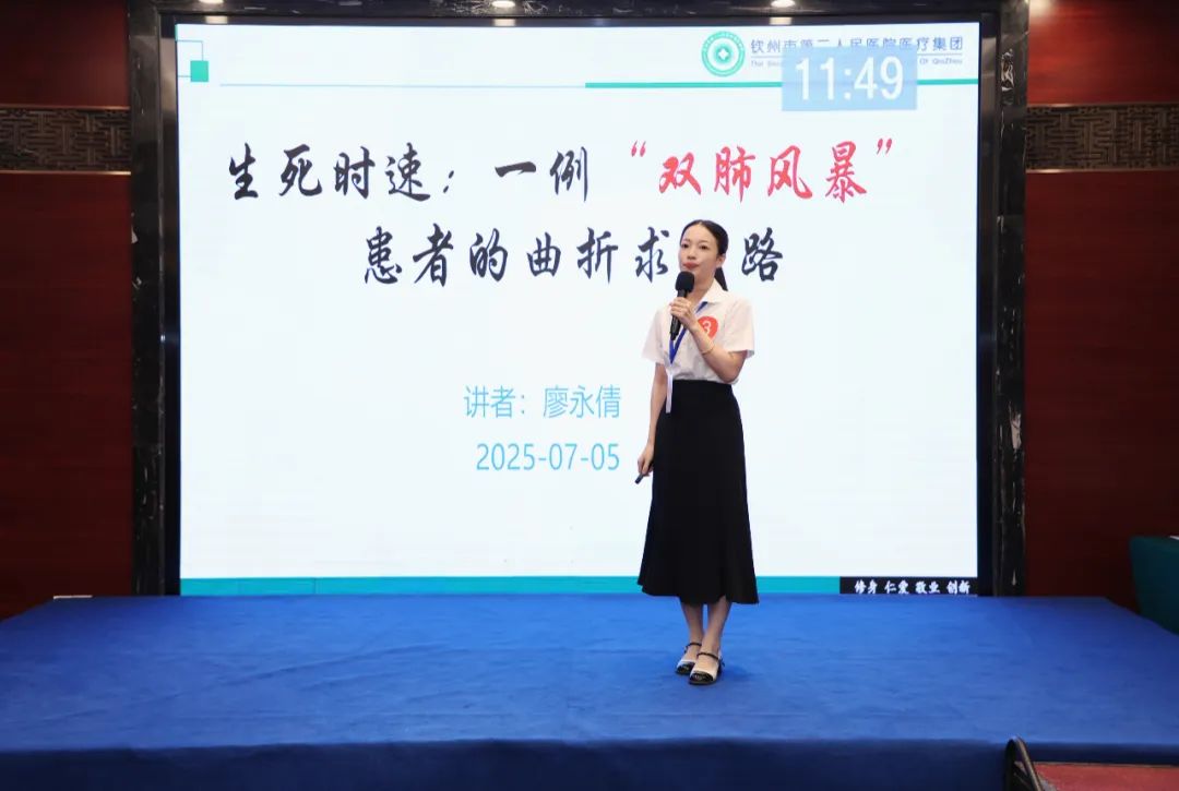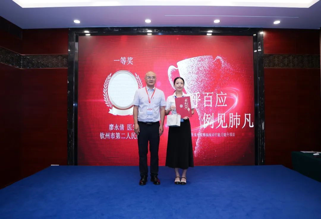 廖永倩医生在比赛中分享了一例极具代表性的呼吸系统疑难危重病例。在病例展示演讲环节,她不仅条理清晰地展示了完整的诊疗流程,更深刻剖析了诊疗决策背后的循证依据,充分展现了其面对复杂病情时敏锐的洞察力、规范化的诊疗思维、多学科协作的整合能力以及对患者个体化需求的深切关注。其专业素养和临场表现赢得了现场评审专家们的一致高度评价,最终拔得头筹!并有幸作为广西区内唯一代表,参加全国半决赛,与来自全国各地的顶尖呼吸科精英同台竞技,向更高的荣誉发起冲击!