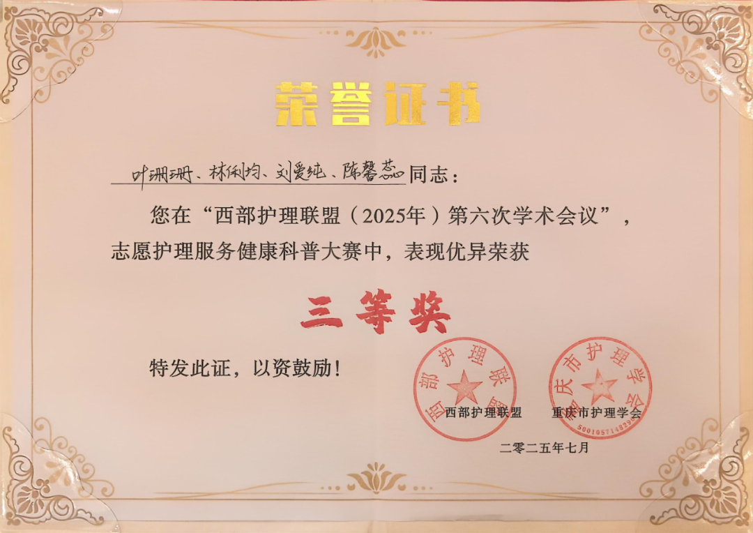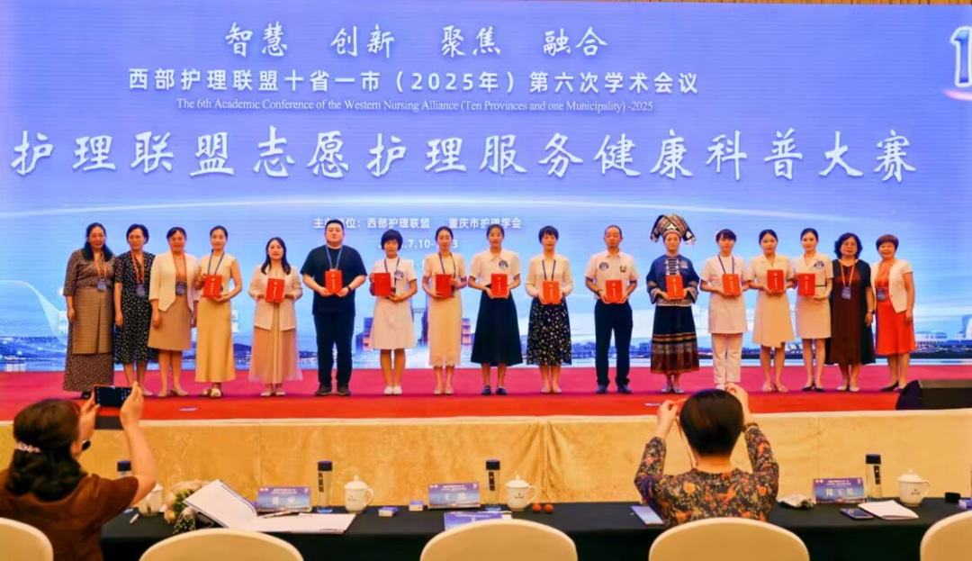 7月10日至13日,西部护理联盟(2025 年)十省一市第六次学术会议志愿护理服务健康科普大赛在重庆隆重举行。在这场由西部护理联盟与重庆市护理学会联合主办的赛事中,我院护理团队凭借过硬实力崭露头角 ,在十省一市 26 支精英队伍的激烈角逐中脱颖而出,成功斩获三等奖。