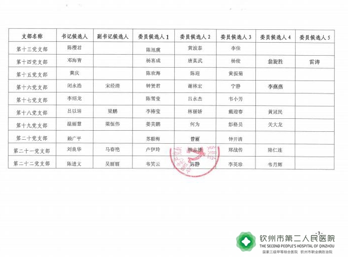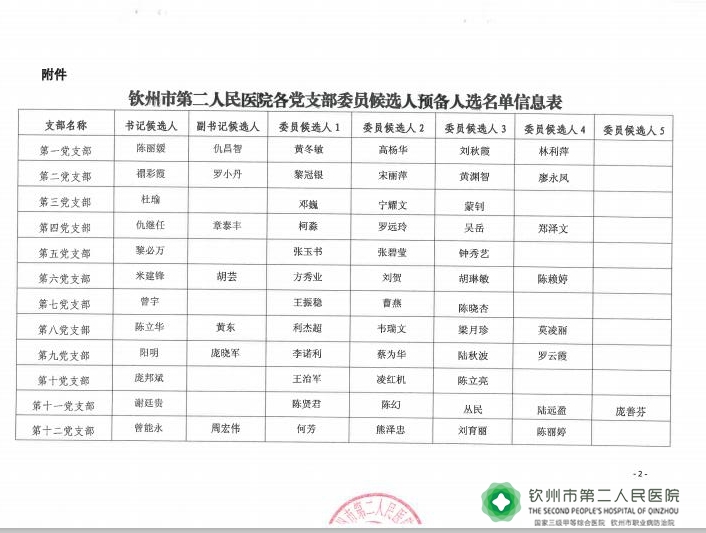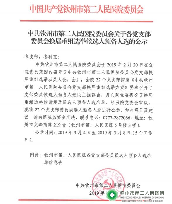 中共钦州市第二人民医院委员会关于各党支部委员会换届重组选举候选人预备人选的公示
