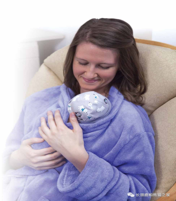●调整以最舒适、最适合宝宝的姿势,让宝宝以直立式或60°角趴睡在父母亲胸前,肌肤相触;用一只手托住婴儿的颈部和背部,将宝宝的下颌轻轻抬起;用另一只手臂支托宝宝的臀部,可在宝宝的背上覆盖小毛毯,或戴上帽子加强保暖;